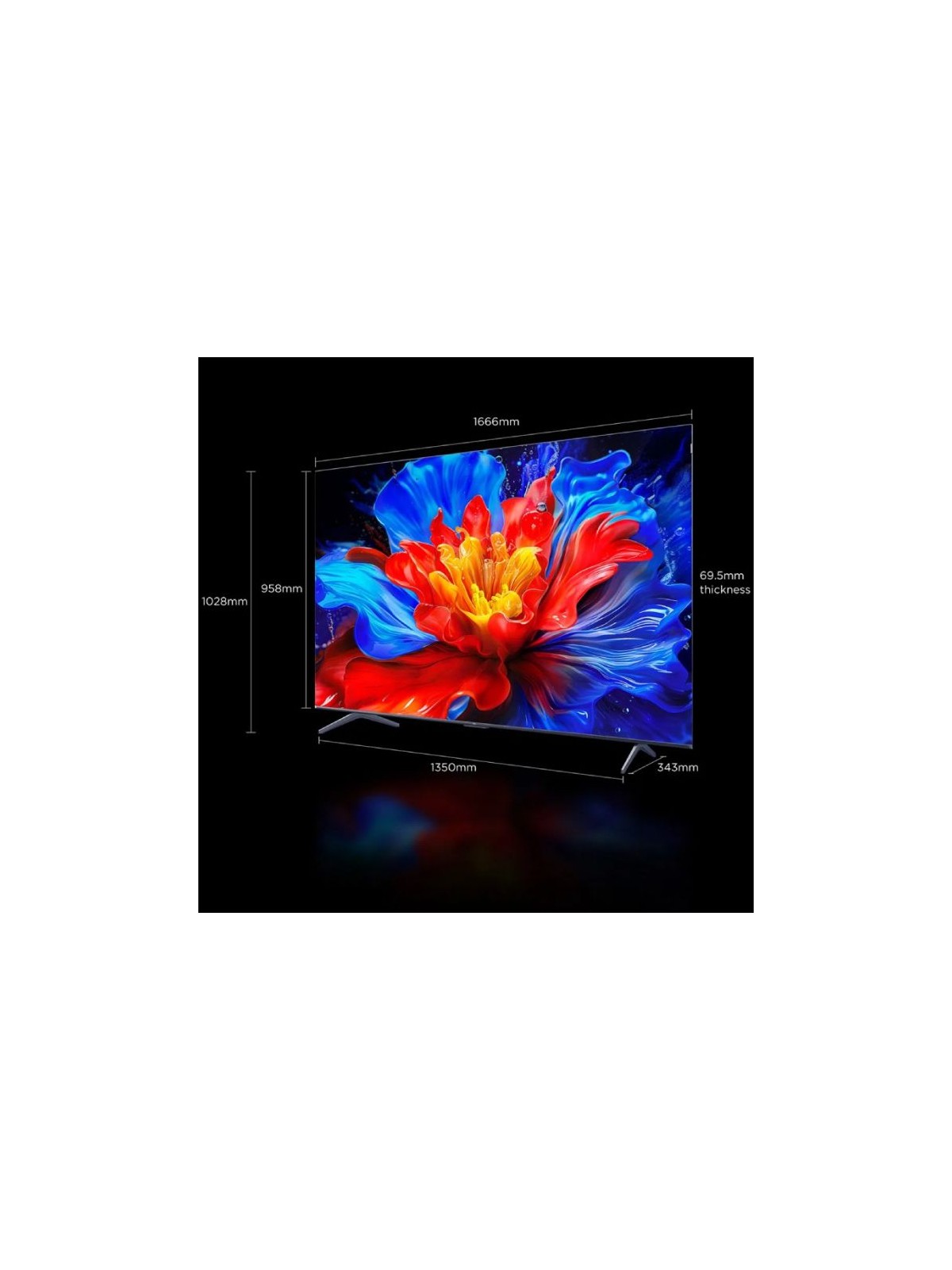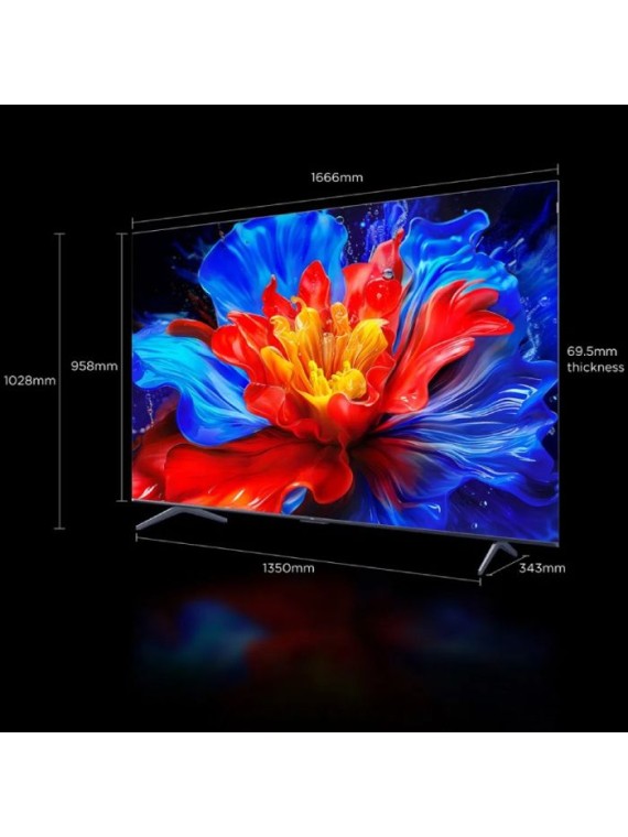 Tv TCL 75" Smart P8K 4K UHD - Résolution: 3840 x 2160 pixels - Miracast et Google TV - Format d’image: 16:09 - Taux de rafraîchissement: 100/120/144 Hz / 288 Hz Full HD - Dolby Vision - Dolby Atmos - HLG - HDR 10 - - Cristal quantique coloré (Plus d'un milliard de teintes de couleurs) - MEMC: réduit les flous d'affichage de mouvement - Puissance sonore: 2x10W+15W - Google Assistant, Alexa - Connectivité: Wi-Fi 2.4G/5G, Bluetooth 5.4 - Design Premium et élégant sans cadre - Connecteurs: 4 x HDMI | 1 x USB-A | 1 x Ethernet (LAN) - Dimensions avec support: 1666x1028x343 mm - Garantie: 2 ans