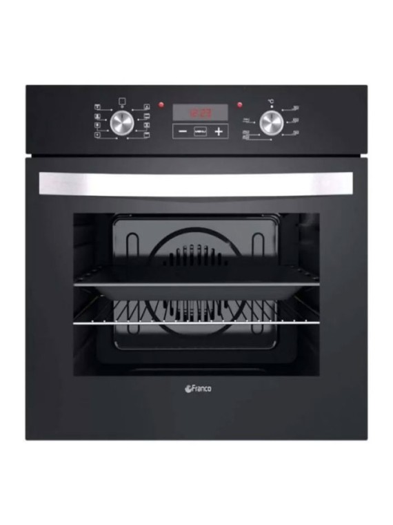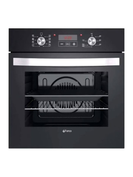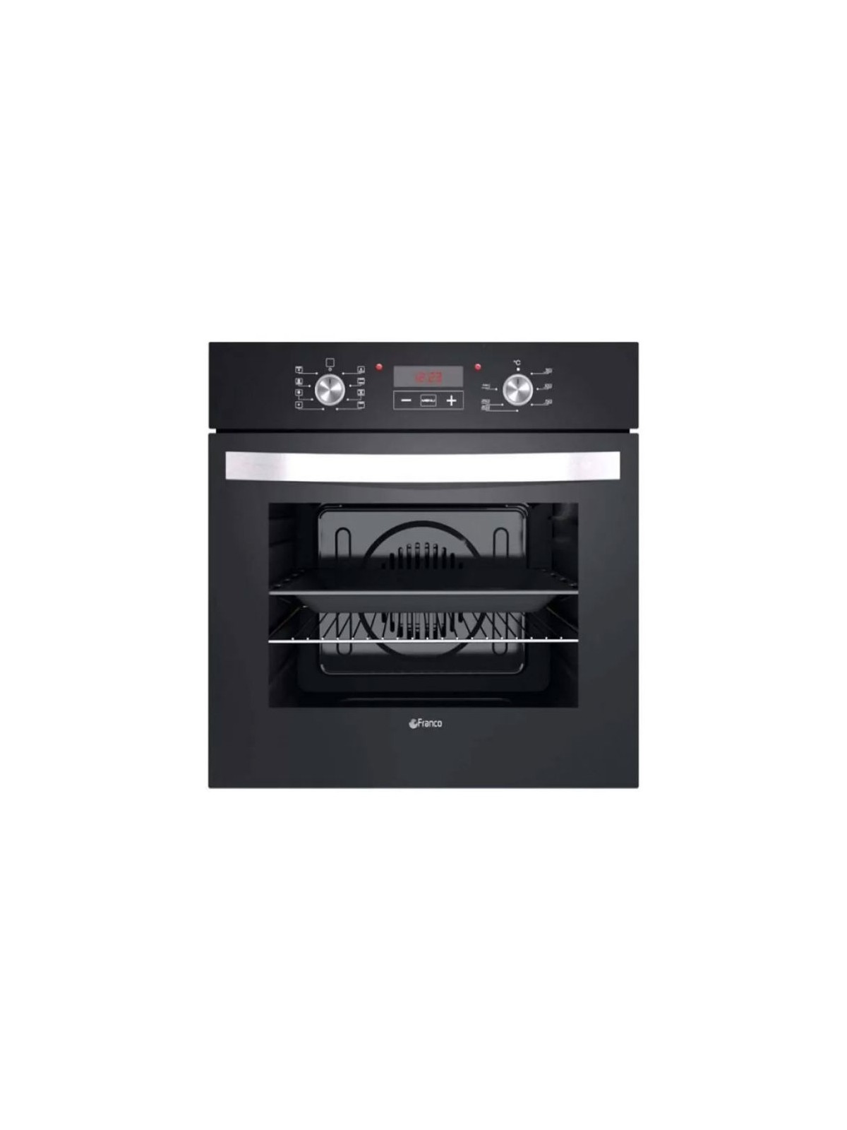 Four Encastrable Électrique FRANCO - Volume: 66 L - Largeur: 60 cm - Convection naturelle 6 fonctions - Minuterie mécanique - Chaleur tournante - Afficheur: LCD - Cavité en émail lisse facilite l'entretien - Grille - Boutons rétractables - Poignée en Aluminium - Couleur: Noir - Garantie: 2 ans