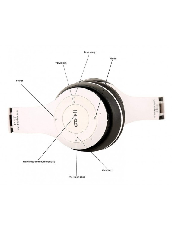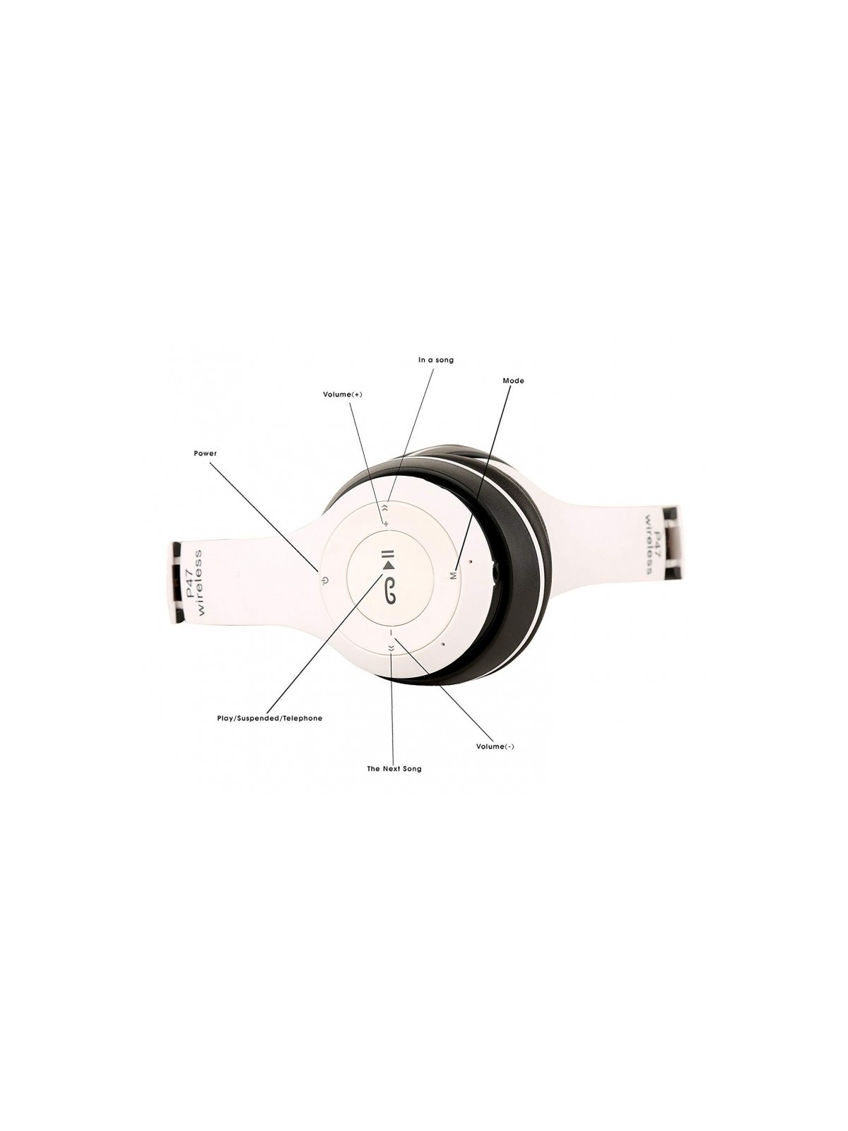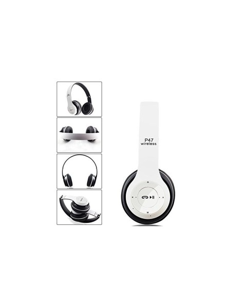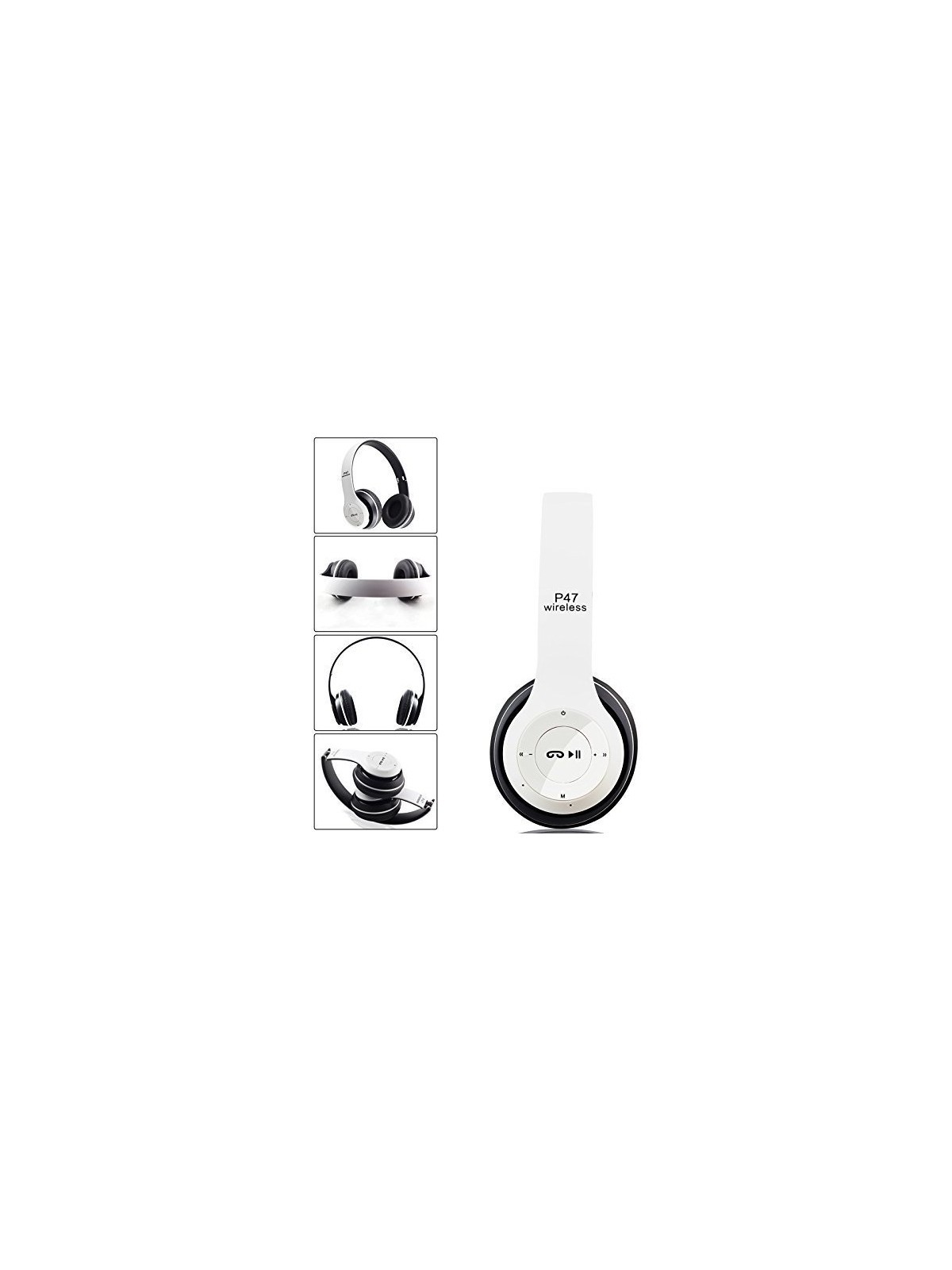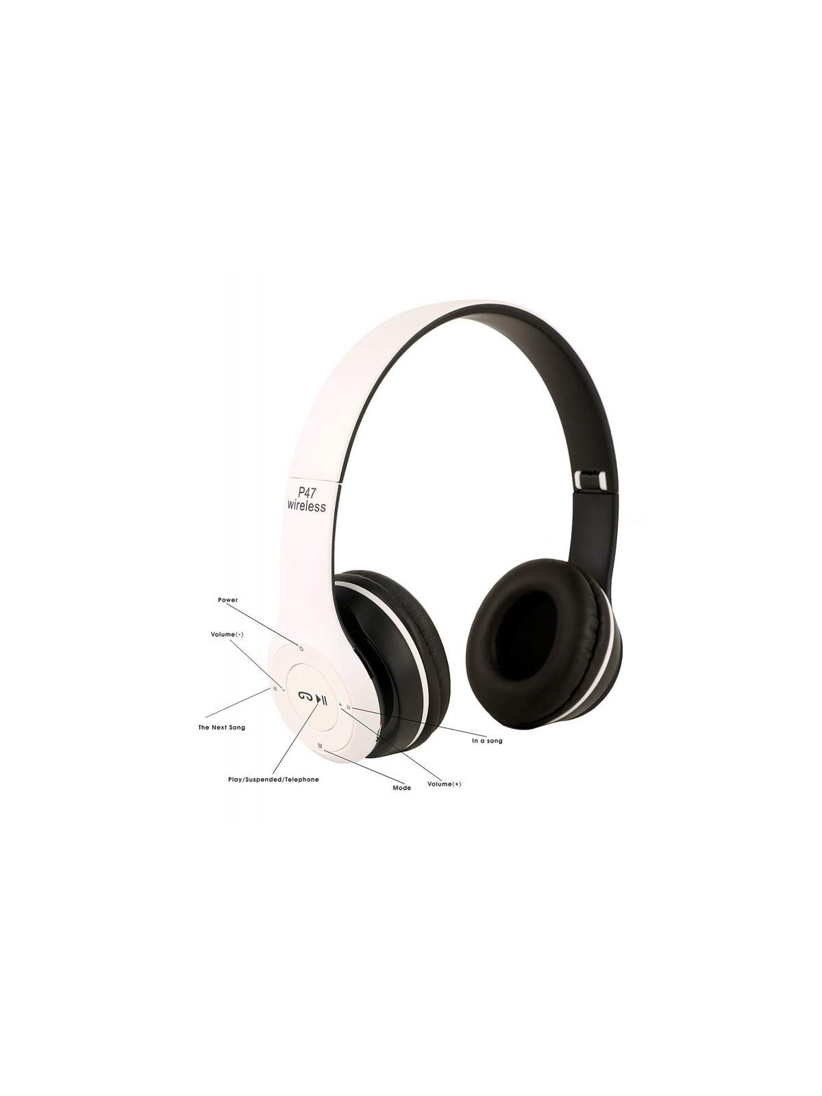 Casque Bluetooth P47 avec Micro - Bluetooth 4.1 - Diamètre 40mm - Portée: 10 mètres - Fréquence: 50HZ-20KHz - Temps de charge: 2 heures - Autonomie: Jusqu'à 15 heures - Technologie de réduction du bruit - Prend en charge le basculement automatique vers la fonction d'appel entrant - Bandeau Pliable - Support carte mémoire - Couleur: Blanc et Noir