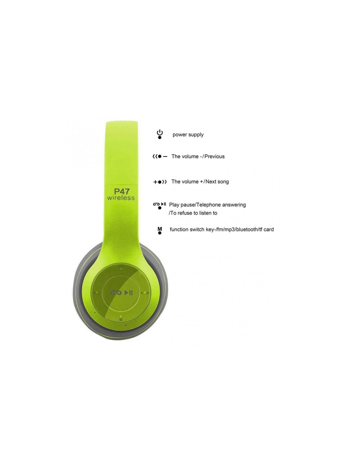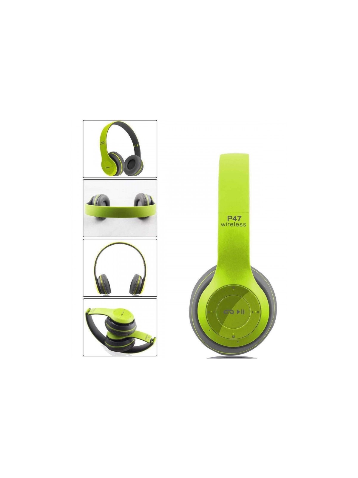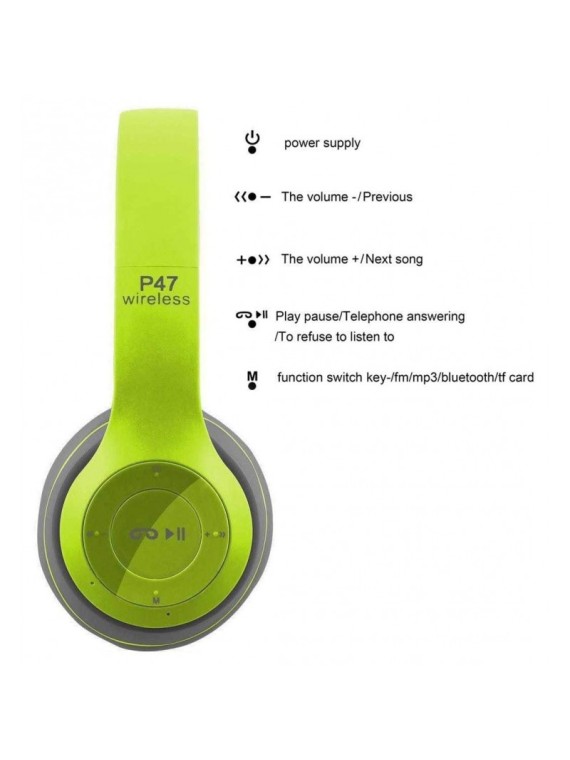 Casque Bluetooth P47 avec Micro - Bluetooth 4.1 - Diamètre 40mm - Portée: 10 mètres - Fréquence: 50HZ-20KHz - Temps de charge: 2 heures - Autonomie: Jusqu'à 15 heures - Technologie de réduction du bruit - Prend en charge le basculement automatique vers la fonction d'appel entrant - Bandeau Pliable - Support carte mémoire - Couleur: Vert et Gris - Garantie 1 an