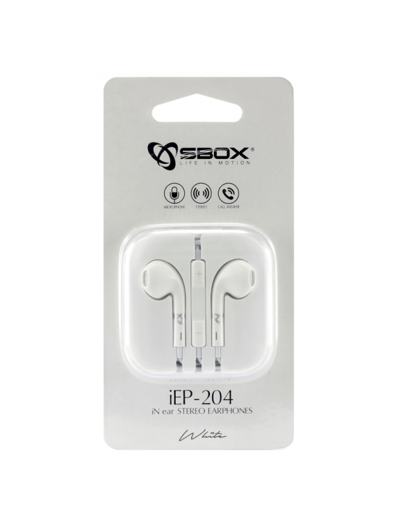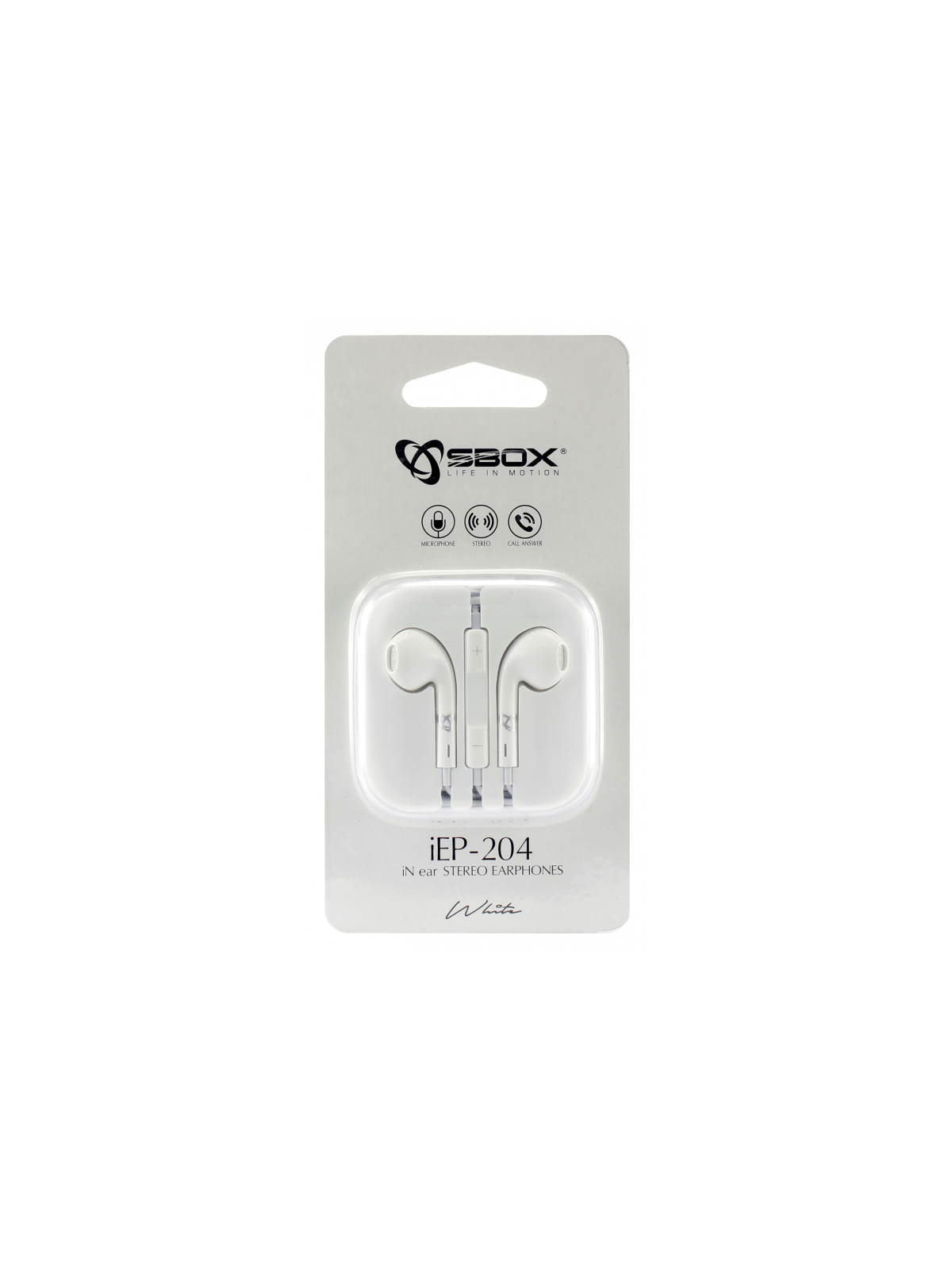 Écouteurs avec Microphone SBOX IEP-204W - Intra-auriculaire - Fréquence 18 Hz - 20 KHz – Sensibilité 116 ± 3dB - Impédance 32 Ohm - Connecteurs Stéréo 3.5 mm - Longueur de câble 1.1 m - Couleur Blanc