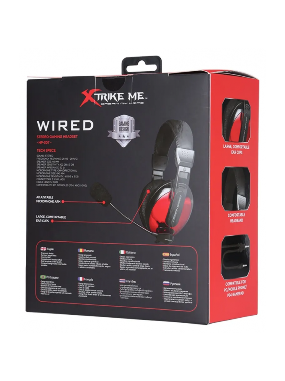Casque Micro Gaming Xtrike Me HP-307- Réponse de fréquence: 20 Hz - 20 kHz - Taille du haut-parleur : 40 mm - Sensibilité du haut-parleur : 102 dB et 3 dB - Type de microphone : omnidirectionnel - Taille du microphone: 6x5 mm - Sensibilité au microphone : -65 dB et 3 dB - Connecteurs: 2x 3.5 mm jack - Longueur du câble : 1.8m - Compatibilité: PC, téléphone mobile, consoles (PS4, Xbox One) - Garantie 1 an