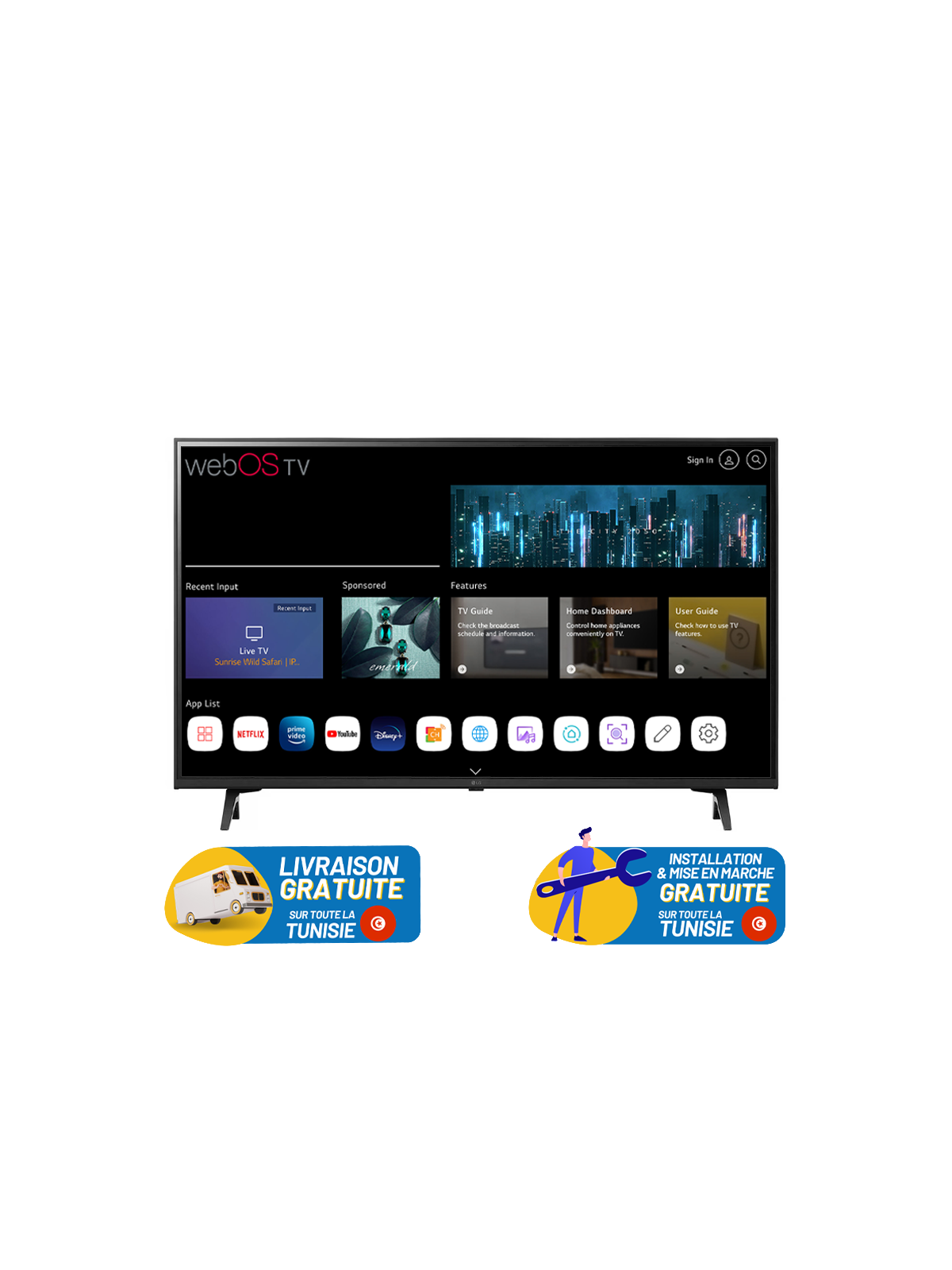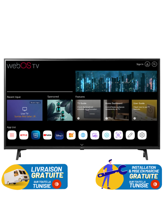 Téléviseur LG 43" Smart - Résolution : 3840 x 2160 Pixels 4K Ultra HD - Système d'exploitation : webOS 24 - Processeur d'image : Processeur α5 AI 4K Gen7 - Taux de rafraichissement : 50Hz Natif - HDR : HDR10 / HLG - AI Sound Pro (Virtualisation 9.1.2) - Synchronisation du son LG - Sortie Audio : 20W - Diffusion haut-parleurs : 2.0 canaux - Rétroéclairage Direct LED - Etalonnage automatique - Navigateur Internet - Contrôle de la luminosité par l'IA - MODE CINÉMA™ - Optimiseur de Jeu - Application Smartphone : LG ThinQ - Reconnaissance vocale intelligente - Connectivité : WiFi 5, Bluetooth 5.0 - Connecteurs : 3x HDMI, 2x USB 2.0, 1x RJ45, 1x Sortie audio, 2x entrée RF - Poids Net : 8.8Kg - Dimensions (LxLxH) : 967 x 564 x 57,1mm (Sans Pied), 967 x 621 x 216mm (avec pied) - Garantie 2ans