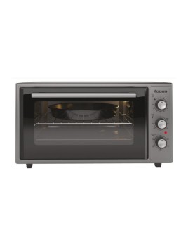 FOUR ÉLECTRIQUE VENTILÉ FOCUS - Puissance: 2000 Watts - Volume: 45 Litres - Température: Réglable jusqu'à 250°C - Minuterie: 90 min - Chaleur tournante - 6 Fonctions - Fonction Yaourt - Cavité Emaillée - Thermostat capillaire - Alimentation: 220-240V/50-60hz - 1 x Grill - 1 x Plateau rectangulaire - 1 x Plateau Rond - Couleur: Gris - Garantie: 1an