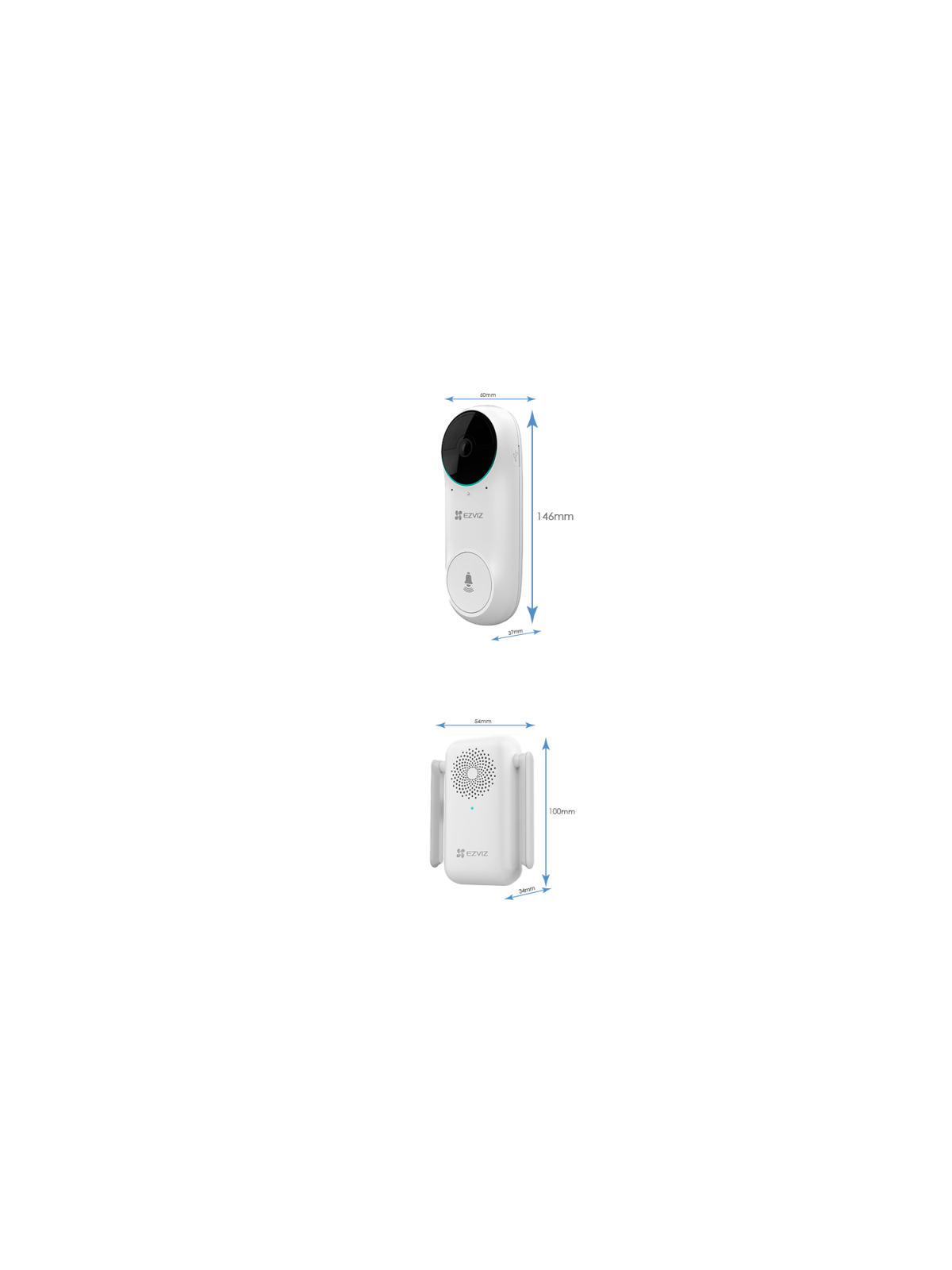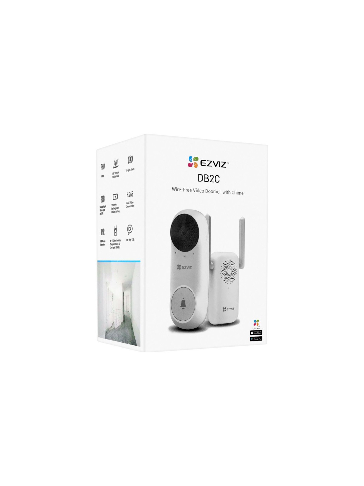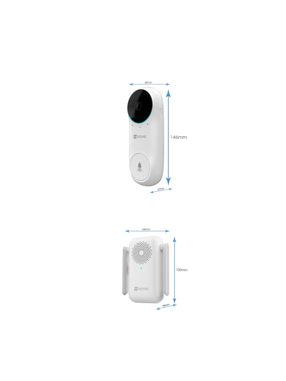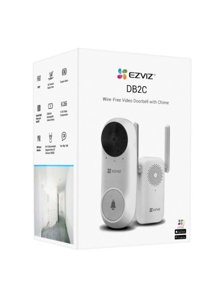 Sonnette vidéo EZVIZ sans fil avec carillon - Capteur d'image : CMOS à balayage progressif 1/2.7" - Résolution maximale : 1536 x1536 - Compression vidéo : H.265 et H.264 - Débit binaire adaptatif - Filtre mécanique amovible - Eclairage IR jusqu'à 6 mètres - Angle de vision : 160°(V) - Optique fixe de 2,2 mm - Modes d'image : 2D/3D-DNR - Capteur PIR avec une portée de 5 mètres à 100° et trois niveaux de sensibilité - Microphone intégré à haute sensibilité - Haut-parleur haute puissance intégré - Bouton de réinitialisation - Alarme anti-sabotage - Slot pour carte MicroSD jusqu'à 256GB - WiFi - Sécurité : WEP 64/128 Bit, WPA/WPA2, WPA-PSK/WPA2-PSK - Visualisation à distance avec les smartphones - Dimensions de la sonnette vidéo : 54 x 100 x 37 mm - Garantie 1an .