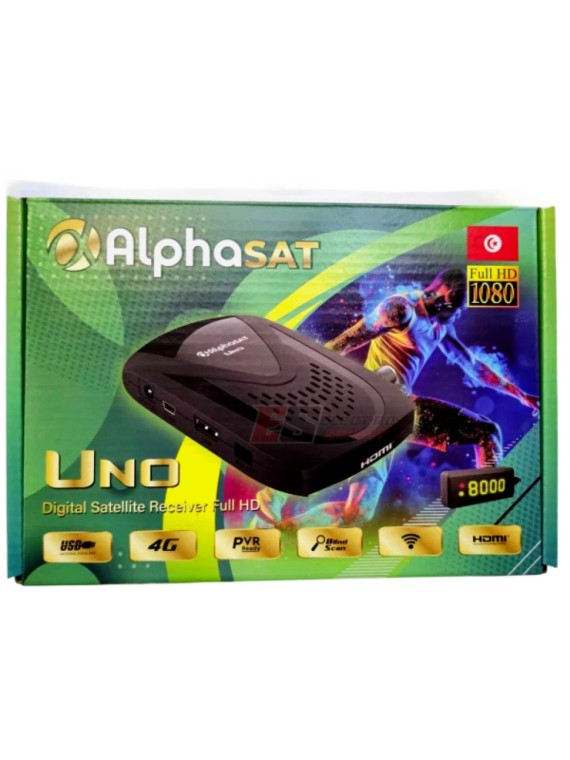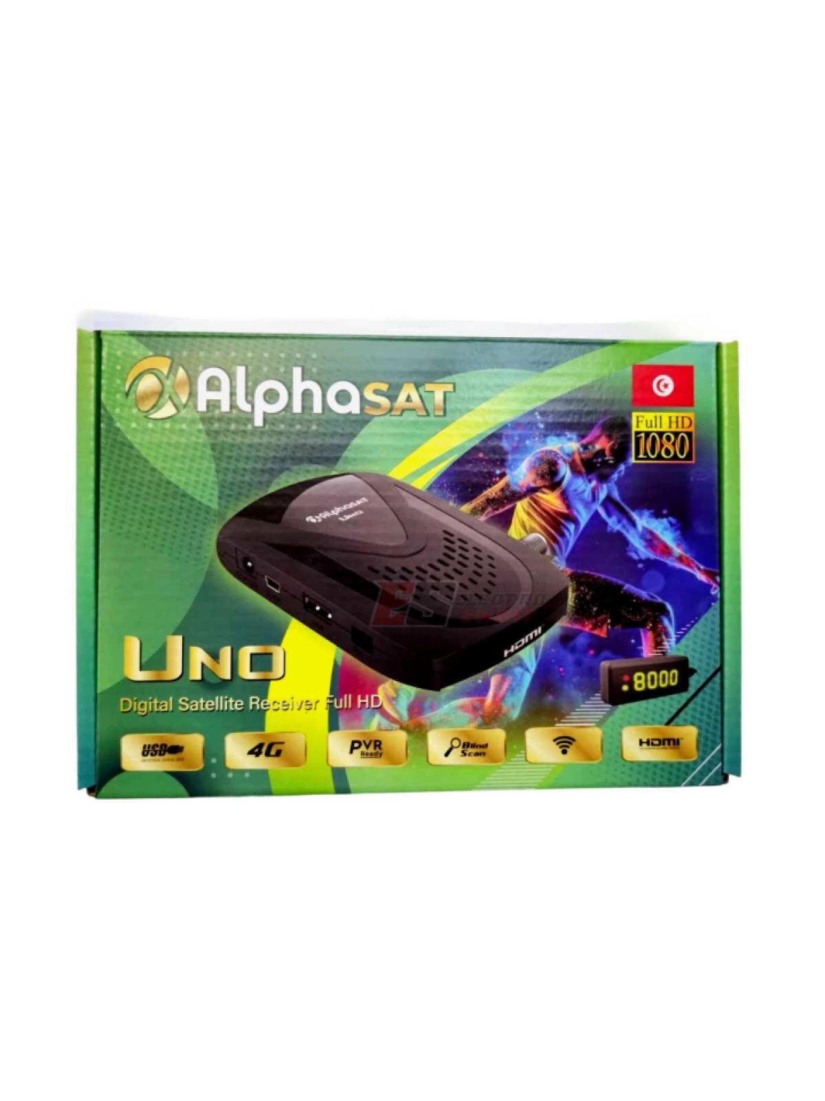 Récepteur Alphasat UNO - Résolution : Full HD 1080 - Connectivité : Wifi - HDMI - USB 2.0 - HDTV - YouTube - Avec télécommande - Stockage mémoire: plus de 100 Satellite, 1000 transpondeurs et 5000 chaines - Multi stream - Couleur : Noir - Garantie : 1 an